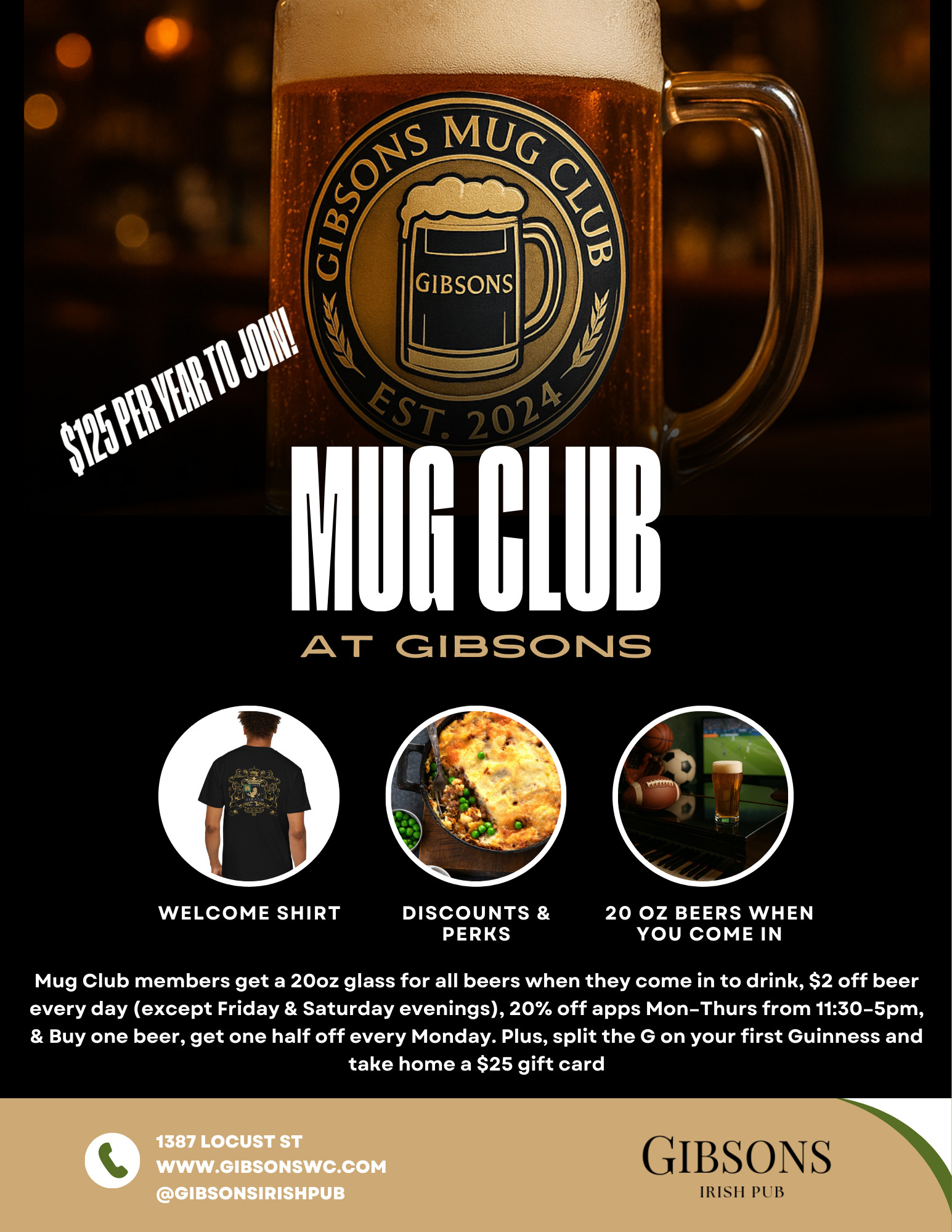 Join the Gibsons Mug Club and sip smarter all year long. For just $125/year, members enjoy 20oz pours on every beer, exclusive discounts, and special perks every time you stop by. Whether you're here for the pints, the food, or the game, the Mug Club is the ultimate way to make Gibsons feel like your second home.